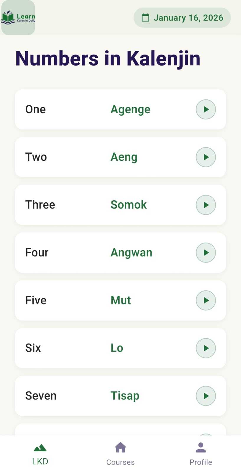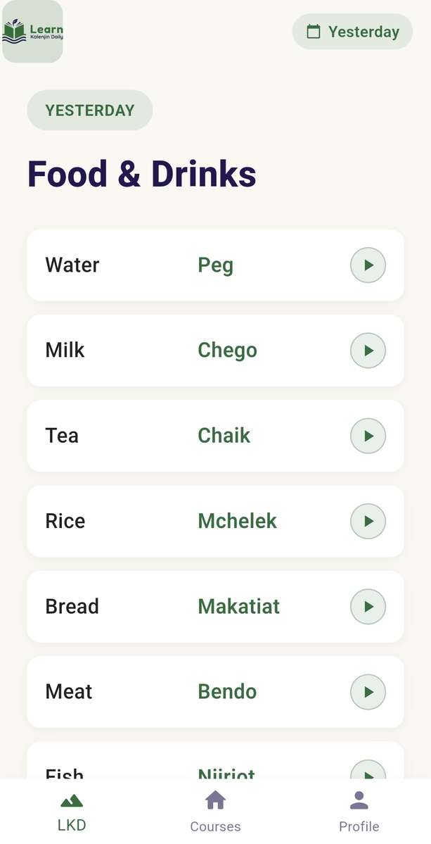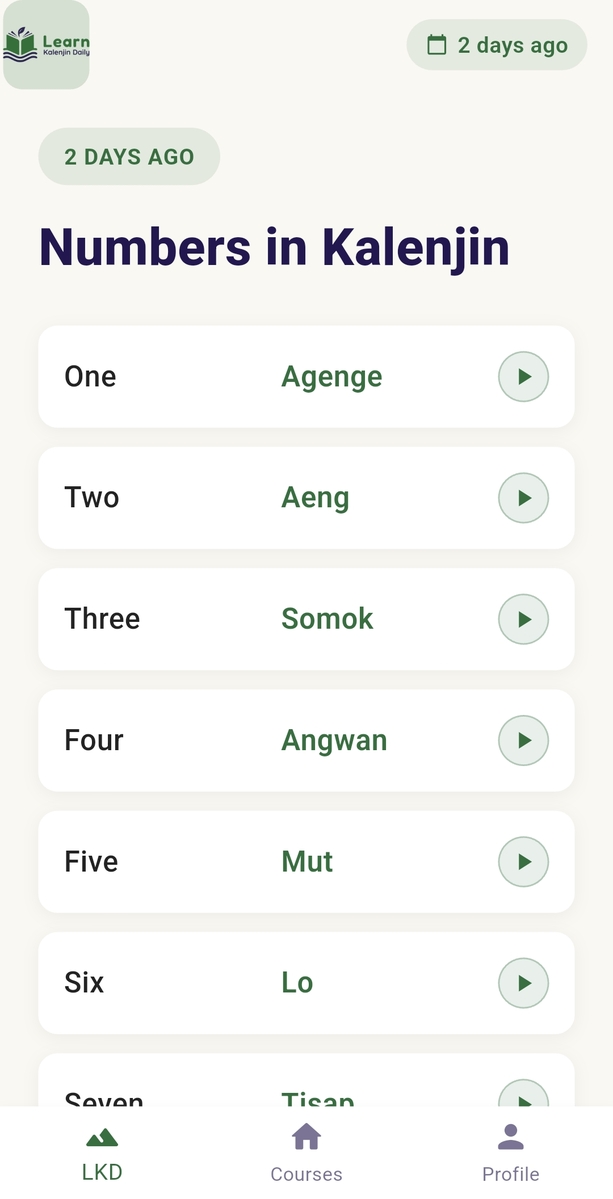 Learn Kalenjin Daily is a Kenyan App that makes learning the Kalenjin language simple, engaging, and consistent. Designed for beginners and language enthusiasts, the app helps you build vocabulary, master pronunciation, and explore Kalenjin culture through short daily lessons.