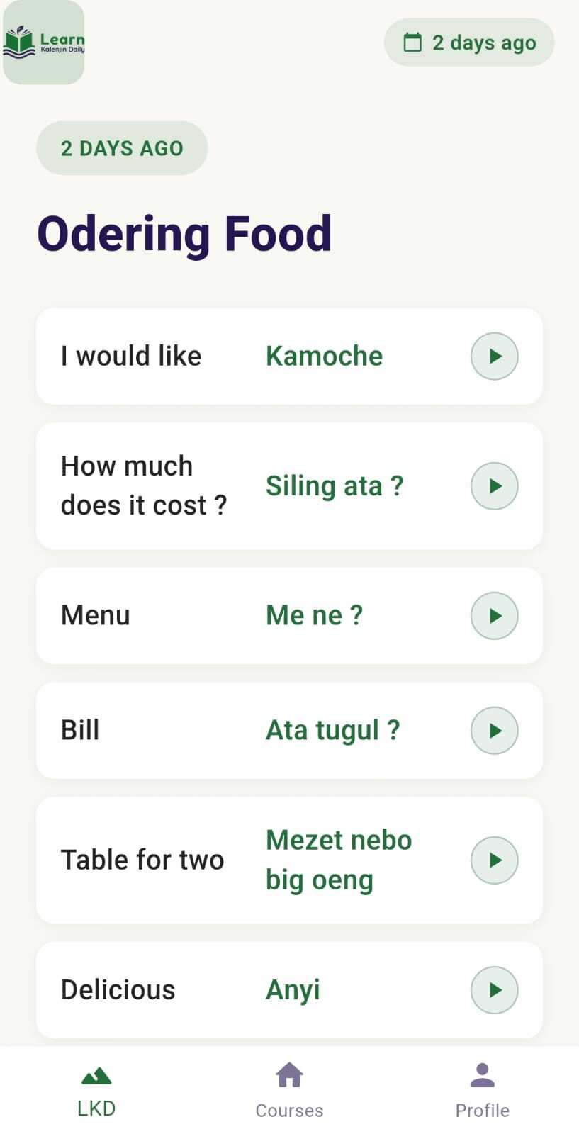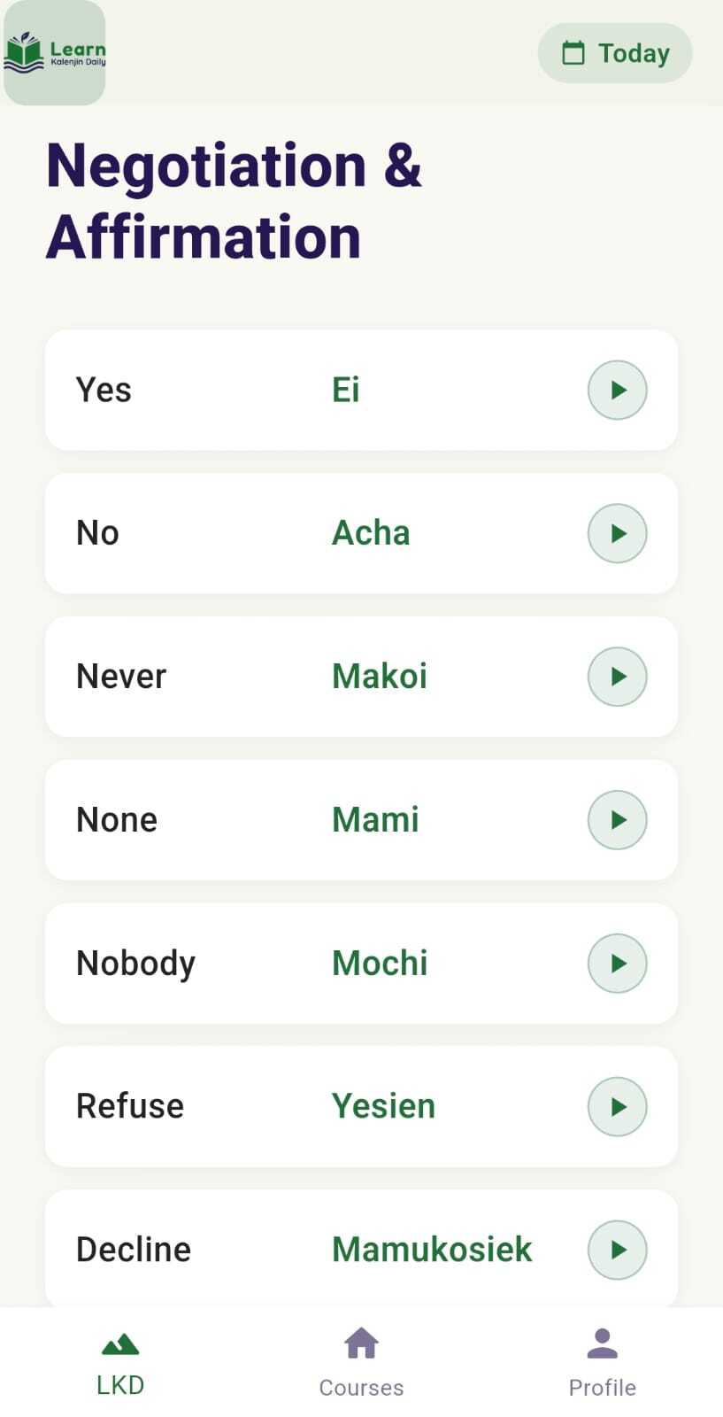 Our app offers a variety of features to enhance your learning experience. Dive into daily lessons, translations with audio. Perfect for anyone looking to learn the Kalenjin language quickly and effectively.